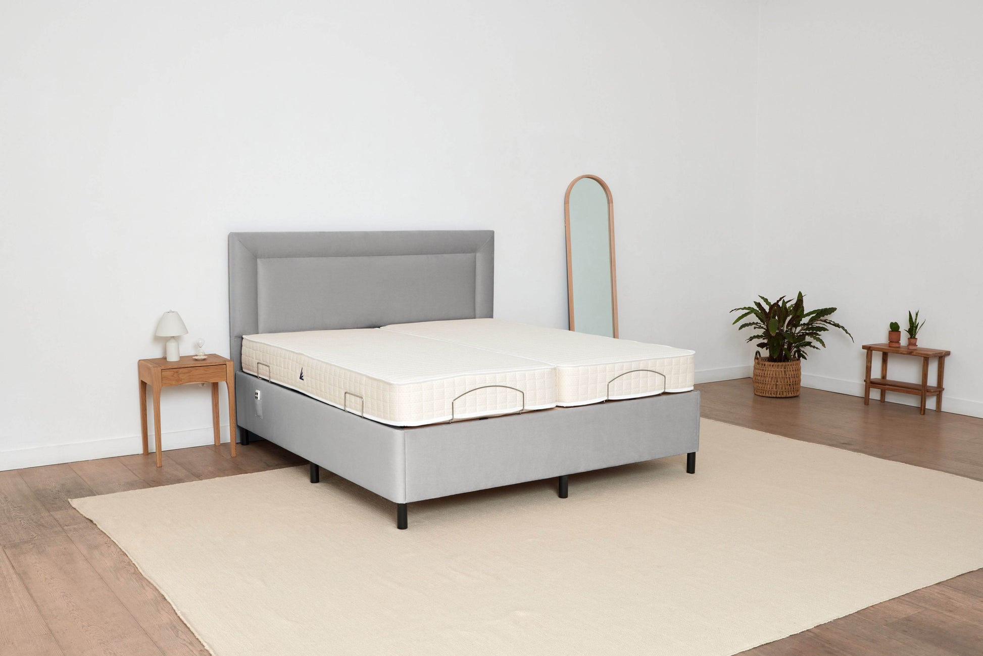 Foam core mattress that moves with the bed frame. Covered in a three inch pressure-relieving smart foam layer to mould to the body. Covered in all natural, chemical free, certified organic materials which includes heat regulating lambswool for comfort and moisture wicking organic cotton for softness.