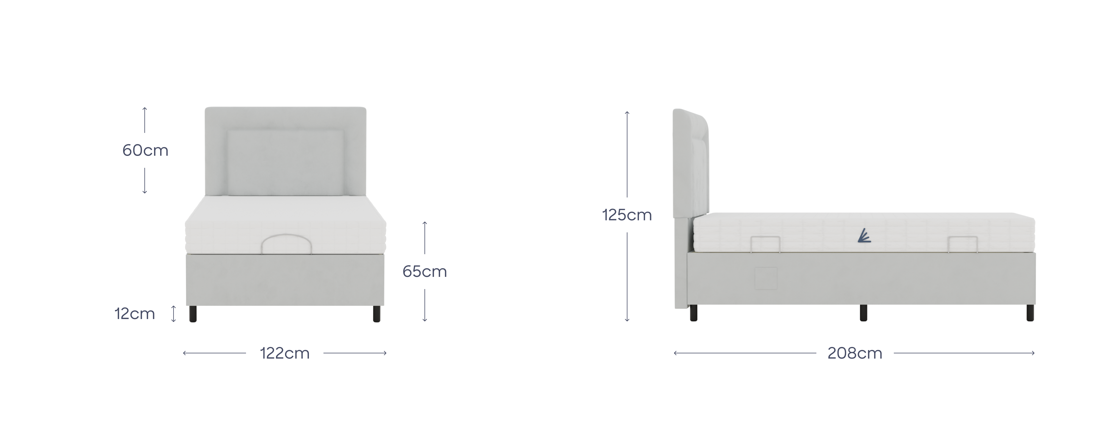 Length 208cm, Width 122cm, Height depends on leg choice either 65 or 57 including mattress